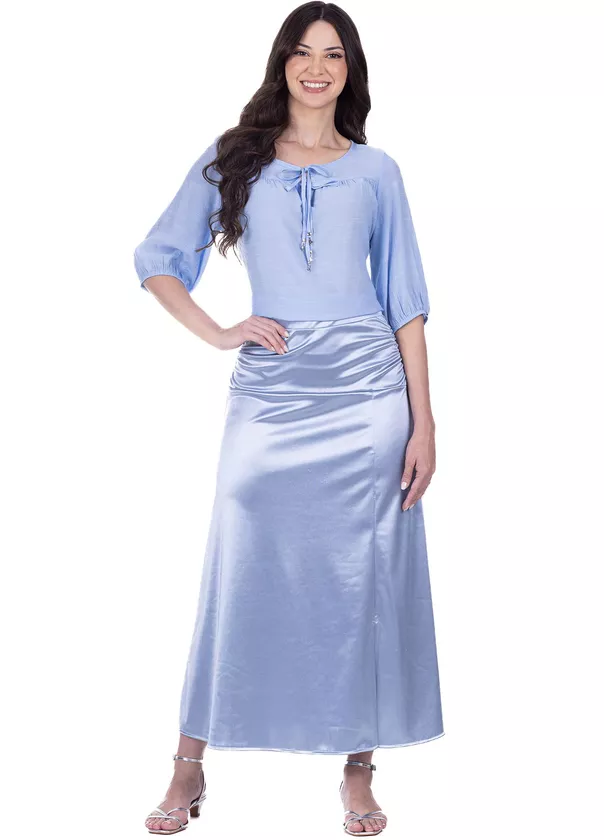 A saia Valentina foi confeccionada em malha acetinada de poliéster com elastano. O modelo apresenta elástico interno cós, as laterais da pala são franzidas, exibe uma fenda frontal, o shape é levemente em A e possui forro. Essa saia traz um ótimo caimento e elegância possibilitando um look elegante e fashionista. Aquela saia linda e chique!