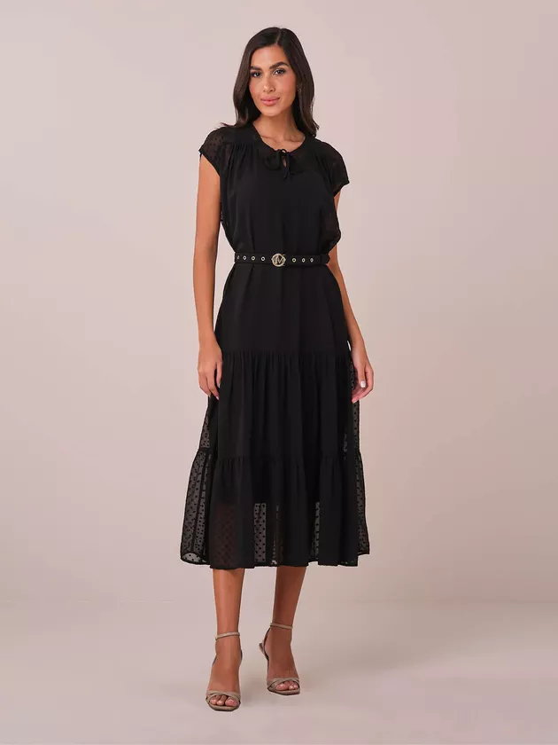 Vestido Edineia – TATA MARTELLO Leveza e charme com toque romântico O Vestido Edineia combina sofisticação e delicadeza em uma proposta encantadora. Confeccionado em chiffon poá leve e fluido, ele traz textura suave e transparência equilibrada, acompanhada de forro separado para garantir conforto no uso. As pregas nos ombros e a amarração no busto valorizam o colo com feminilidade, enquanto os babados na saia adicionam movimento e romantismo ao visual. O cinto exclusivo Tata Martello define a silhueta com elegância, tornando a peça perfeita para ocasiões especiais ou para transformar o dia a dia com um toque refinado. Aquele vestido lindo e elegante!