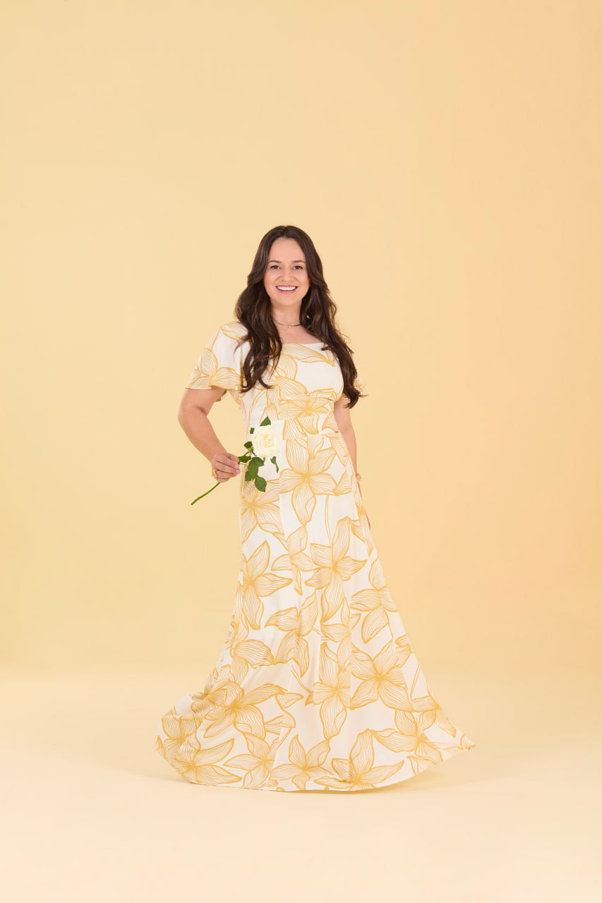 Vestido confeccionado no viscolinho, estampa floral cor amarelo, decote quadrado, manga evasê, bolsos faca funcionais, zíper lateral e lastex nas costas. Comprimento longo, forrado. Aquele vestido chique e especial!