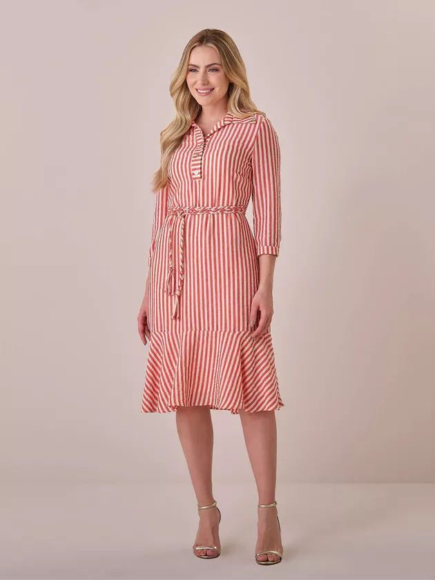 Com visual atemporal e toque moderno, este vestido listrado traz uma combinação equilibrada entre sofisticação e leveza. A gola tradicional e os botões frontais evocam o estilo camisaria, enquanto o babado na barra adiciona fluidez e feminilidade. A faixa trançada na cintura valoriza a silhueta e permite variações no look. Aquele simples que funciona!